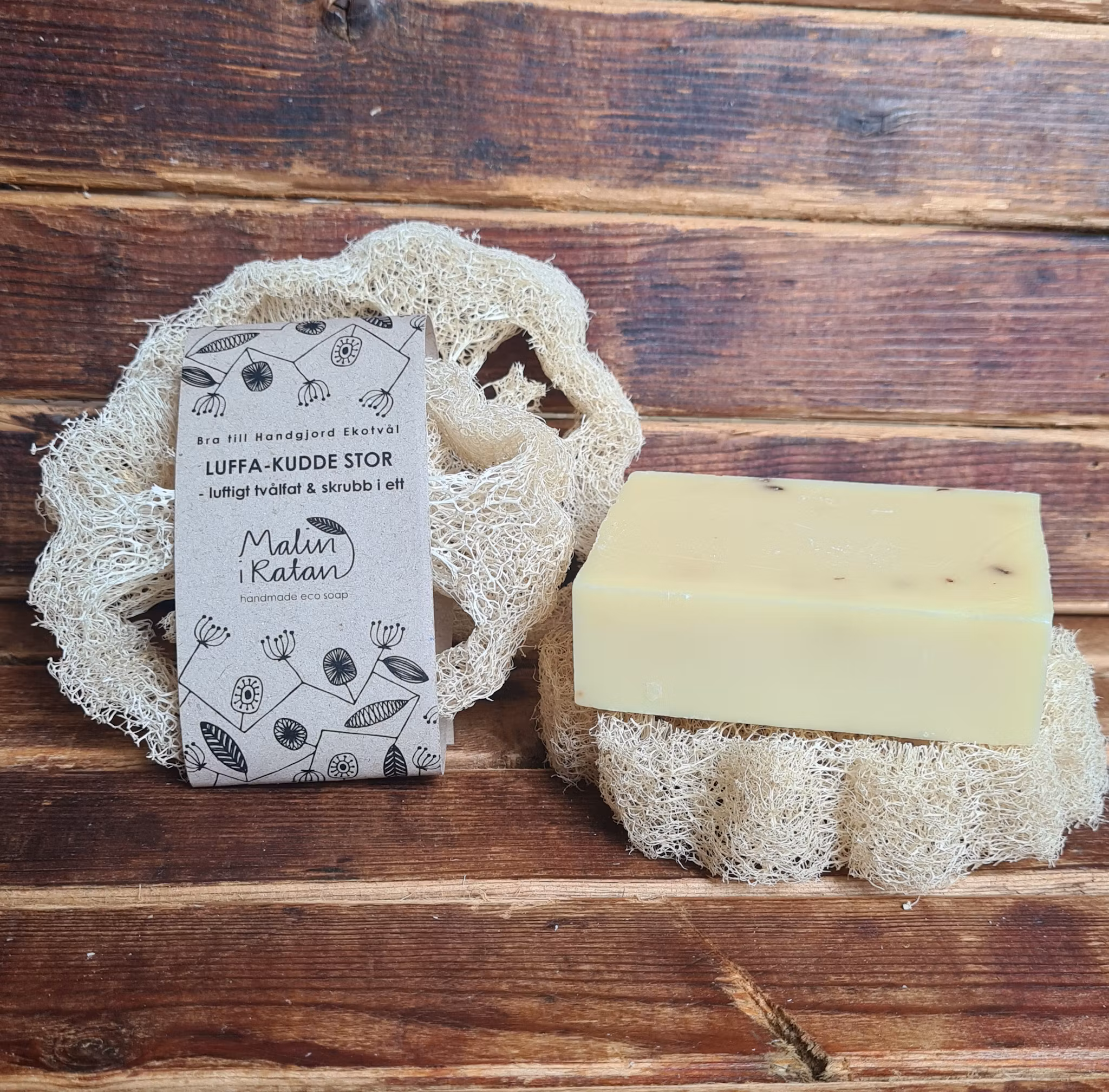 Luffakudden kan dock upplevas hård mot huden då mjukheten på dem kan variera. Vill ni ha en ren kroppsskrubb skulle vi rekommendera Tvålpåsen luffa isället.