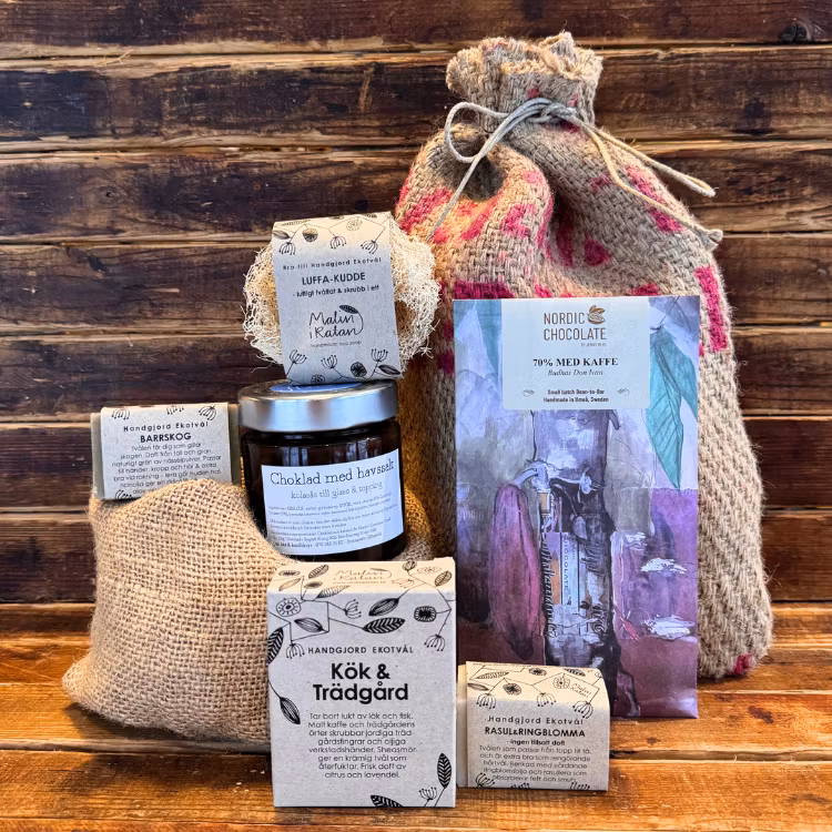 En påse med kvalitetsprodukter från Västerbotten. Hantverksmässig stolthet med ett cirkulärt tänk. Ett samarbete mellan Malin i Ratan, Nordic Chocolate och lokala producenter. Varje påse innehåller en överraskning från en lokal producent. Genom att lyfta varandra blir vi starkare tillsammans!