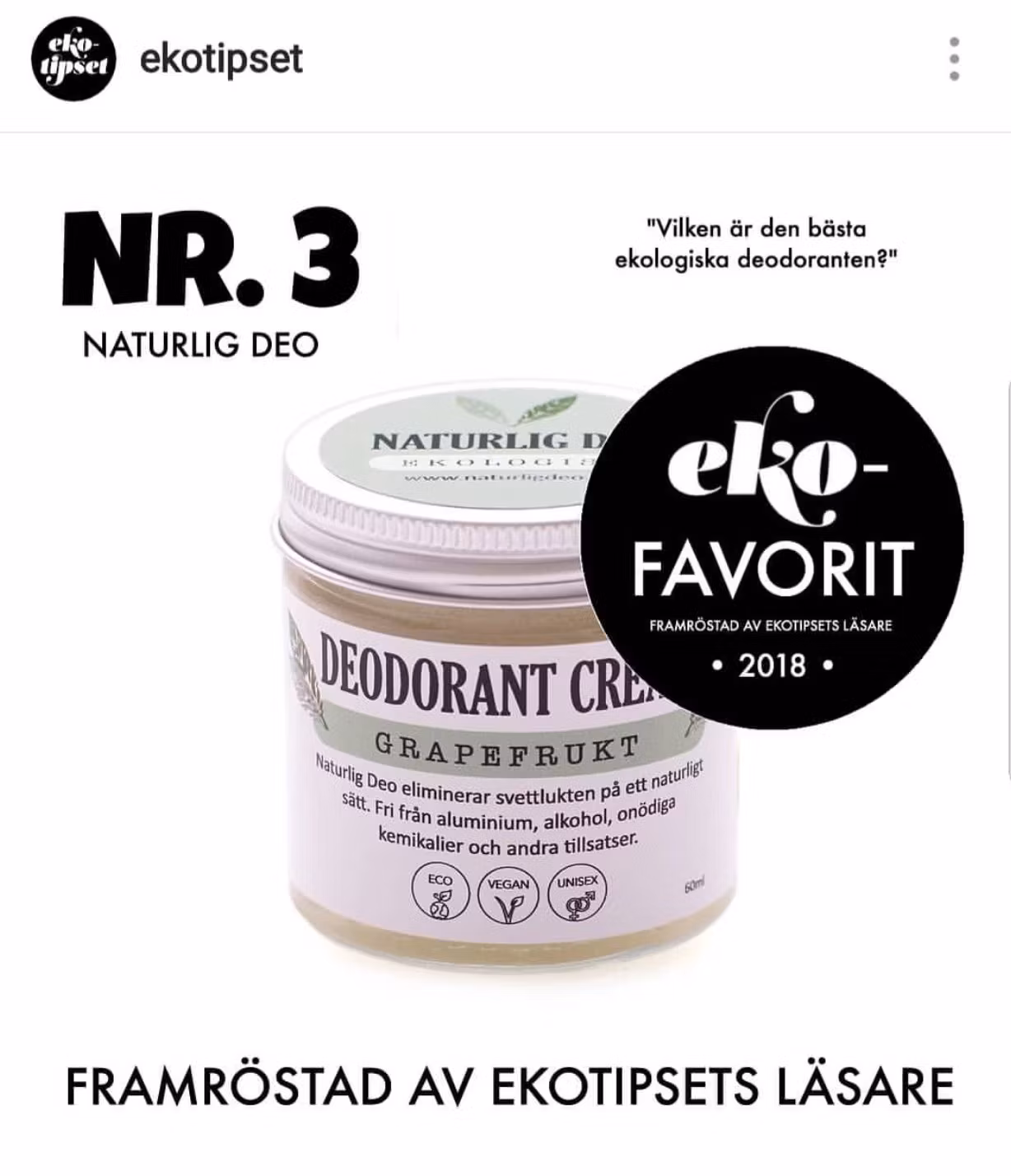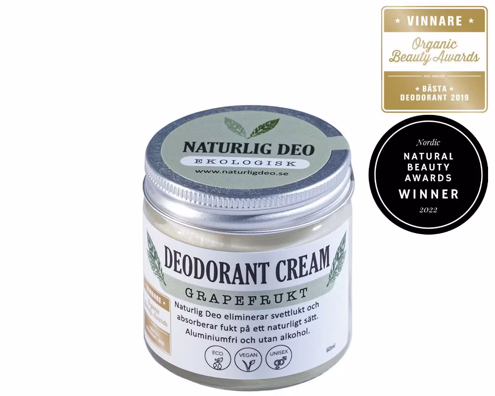 Naturlig Deo är ekologiska deodoranter handgjorda med omsorg för både människa, djur och natur. De tillverkas i Västerbotten av få och noga utvalda ingredienser. Deodoranterna arbetar på ett naturligt sätt med att eliminera svettlukten och absorbera fukt. De är fria från aluminium, alkohol, onödiga kemikalier och andra tillsatser. Naturlig Deo Ekologisk Deodorant Cream är vegansk och unisex.