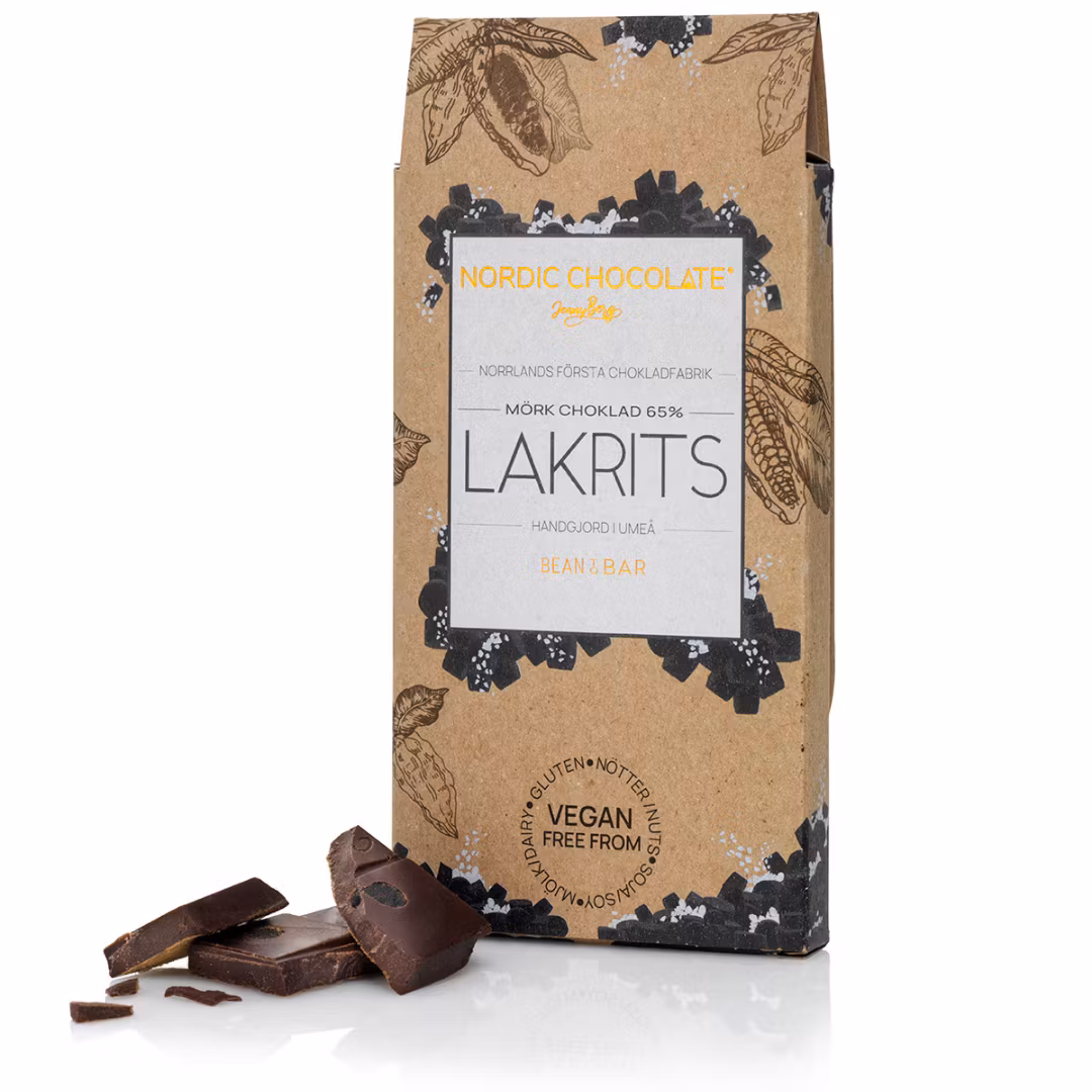 Norrländsk, ekologisk Bean to Bar-choklad från Nordic Chocolate med lakrits från svenska Lakritsfabriken.